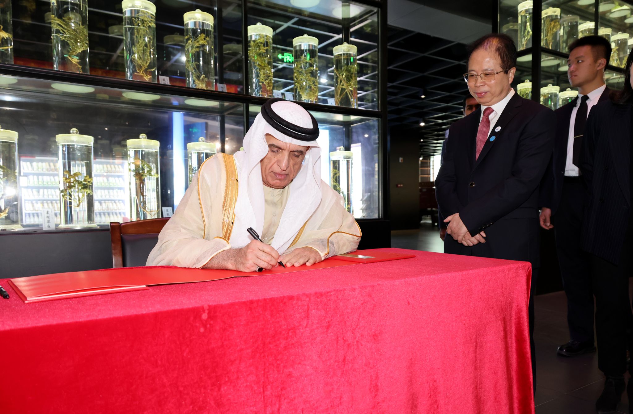 代表团成员哈伊马角美国大学董事长萨里木·阿里·阿勒沙尔汗、哈伊马角医药与健康科技大学校长易斯玛伊·马塔尔卡及哈伊马角古物与博物馆部总经理艾哈迈德·阿勒特尼吉等参加座谈会。他们表示,哈伊马角也拥有传统医学,草本药、海洋药等天然药物运用广泛,民众接受度高。他们希望积极借鉴中国和开云kaiyun官方网站在传统医学领域的丰富经验,建设系统性、全面性的医药体系。双方就签订谅解备忘录,开展师生交换、短期培训、举办文化交流活动,以及天然药物的合作研发等方面进行了洽谈。