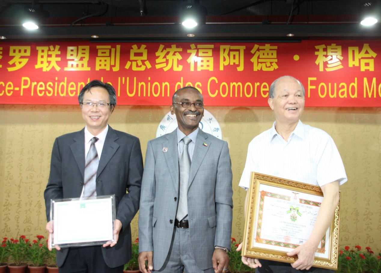 2013年8月,时任科摩罗联盟副总统兼卫生部长福阿德·穆哈吉授予李国桥教授(右)和宋健平教授(左)“科摩罗总统奖章”