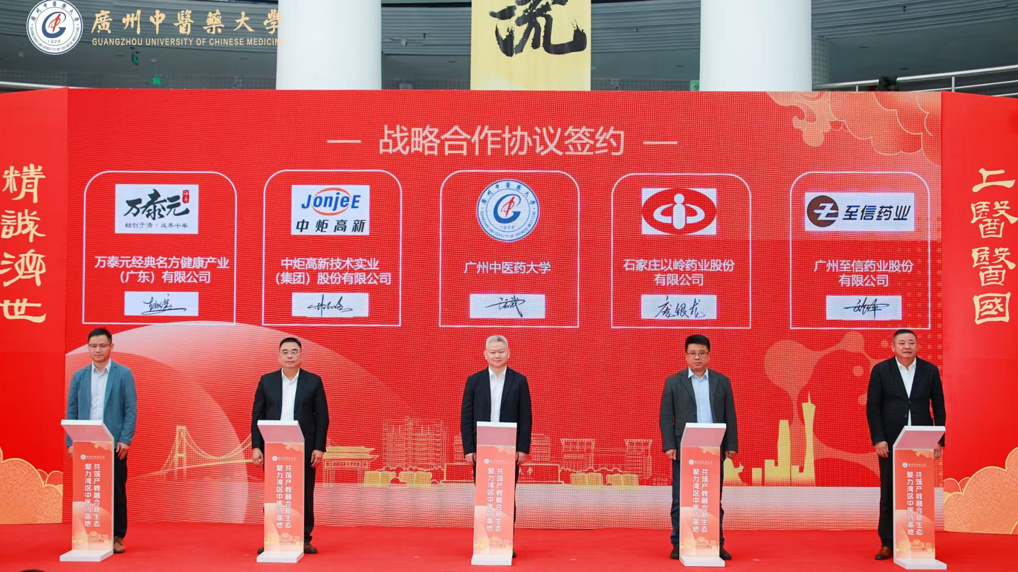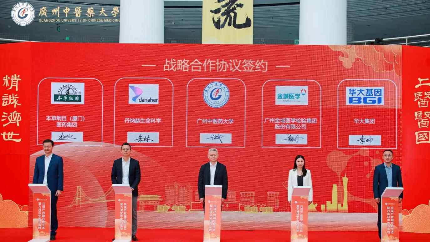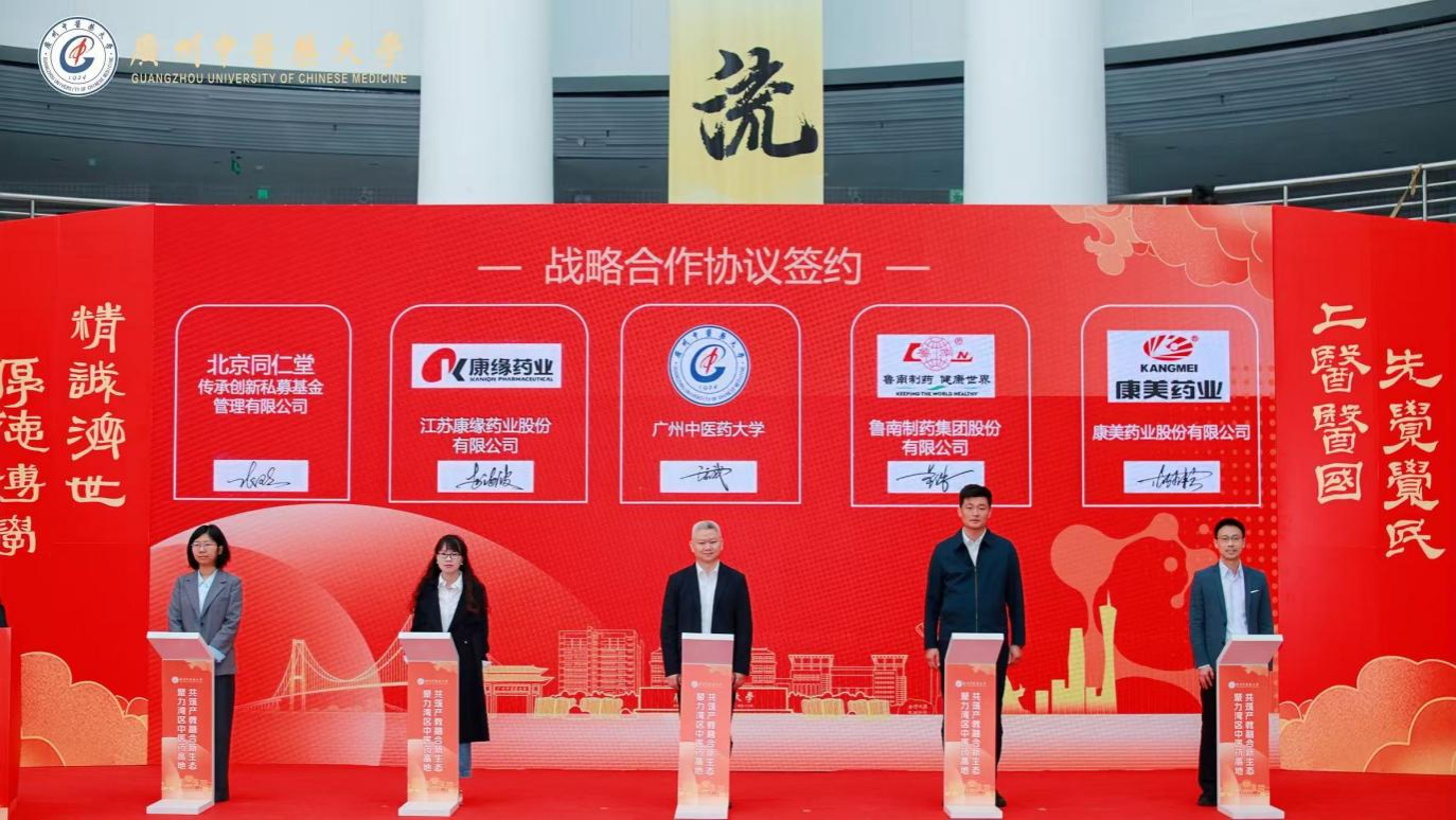 校长王宏斌代表学校,与扬子江药业、华润三九、广药集团、中国中药控股、万泰元经典名方健康产业、以岭药业、广州至信药业、康缘药业、鲁南制药、康美药业、本草纲目集团、丹纳赫生命科学、广州金域医学、华大集团、中炬高新科技实业集团等十余家行业龙头企业签署战略合作协议。校企双方将围绕联合实验室、人才培养、科研项目、科技成果转化等方面深化合作,构建“产学研用”协同创新体系。