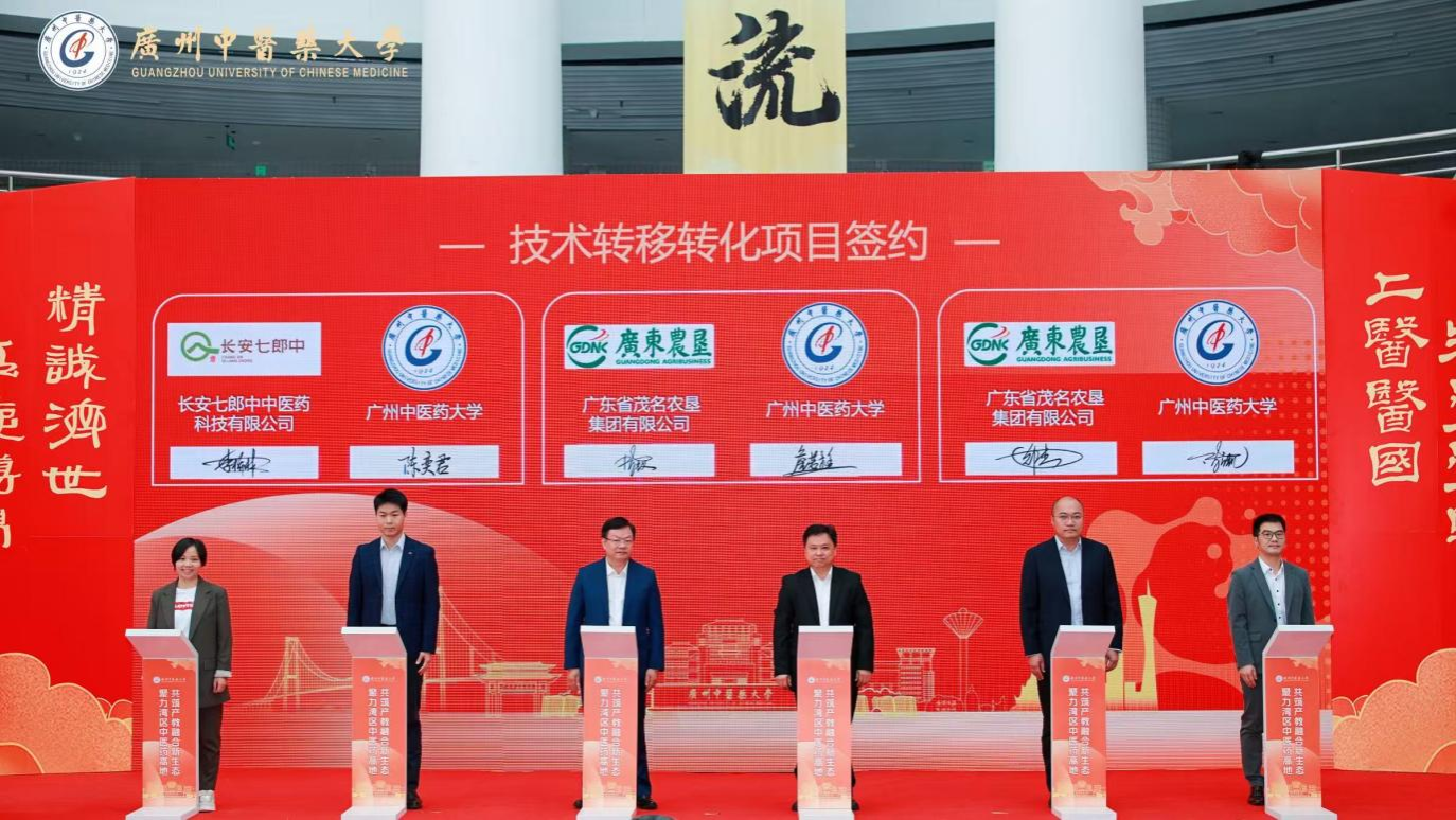学校党委书记陈文锋在致辞中指出,学校近年来已建成9个国家级科研平台与62个省部级平台,形成了完善的研发平台体系。近五年来,学校实现了47项科研成果转化,总金额超过2.6亿元;近三年来与茂名、广东农垦集团共建广东南药种业创新园,吸引企业共建新增种植面积20多万亩,新增产值累计34亿元。当下,粤港澳大湾区已成为国内中医药产业的重要增长极,学校将发挥好国家医学攻关产教融合创新平台等国家级平台的作用,进一步密切政府、产业、高校联动,让科研对接产业,在产业链部署创新链,在创新链孕育和爆发产业链。让中医药拔尖创新人才更加精准对接中医药产业发展需求,使科研攻关更好满足产业升级需求,令科研成果从实验室走进市场,将科研成果的转化实效作为检验科学研究和人才培养成果的金标准,共同为中医药产业、事业高质量发展注入新动能。