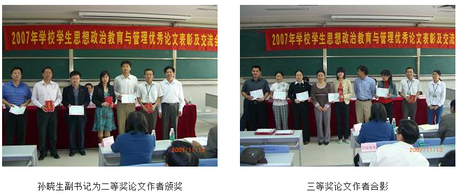会议由学生处林彬处长主持。会议首先由学校党委孙晓生副书记宣读《关于表彰2007年开云kaiyun官方网站学生思想政治教育与管理优秀论文的决定》。本次参评论文共45篇,主要涉及大学生思想政治教育与管理的理论与应用研究,经过七位校内专家的评审,最终评出一等奖3篇,二等奖6篇,三等奖10篇。会上,各级领导分别给获奖作者颁奖并由获得一等奖的作者在会上进行了大会交流。随后由马定科校长助理代表评审专家组,对参评文章进行了细致的点评。马助理从本届参评论文的质量、论文的研究范畴以及论文的文笔功底等方面进行了点评,使论文作者清楚地了解了文章所存在的不足和撰写文章的基本要领。大会最后由党委黄斌书记和孙晓生副书记作总结讲话。黄书记在总结中强调我们思政工作者首先要提高认识,统一思想,切实把加强辅导员队伍建设这项政治任务抓实抓好;其次要立足当前,着眼长远,健全辅导员队伍建设的领导管理体制、工作机制和政策保障机制;要建立学院党政"一把手"领导责任制,把辅导员队伍建设状况作为评估考核学院工作的重要指标,作为学院领导干部业绩考核的重要内容;要健全辅导员选聘、培养、发展、管理机制,鼓励优秀辅导员攻读思想政治教育硕、博士学位,加强培训,促进辅导员骨干队伍向职业化、专家化方向发展,畅通辅导员流动渠道,既吸收优秀人才从事辅导员工作,又积极向其他岗位推荐、输送辅导员,搭建辅导员队伍发展的"立交桥";同时指出,要牢记责任,不辱使命,不断提高辅导员工作水平,以社会主义核心价值体系为根本和导向,组织和指导学生开展多种形式的思想政治教育活动;最后他希望辅导员队伍能不断提高思想政治素质、不断提高专业技能、严格遵守组织纪律、培养良好工作作风,以马克思毛泽东思想、邓小平理论、"三个代表"重要思想为指导,全面贯彻落实科学发展观,为加强和改进大学生思想政治教育,促进高等教育事业持续健康发展,为学校的建设作出新的更大贡献。孙书记的讲话中对此次参评论文的质量作出了肯定,并希望能有更多的思政工作者、行政管理者能参与到其中,真正实现大学生思想政治教育的全员参与;另外他还指出,我校思政工作者的课题研究要注意立足现实问题,减少战略层面的模糊理论研究,增强战术层面的实用应用研究,为把我校思政工作推向一个新的高度而不懈努力。