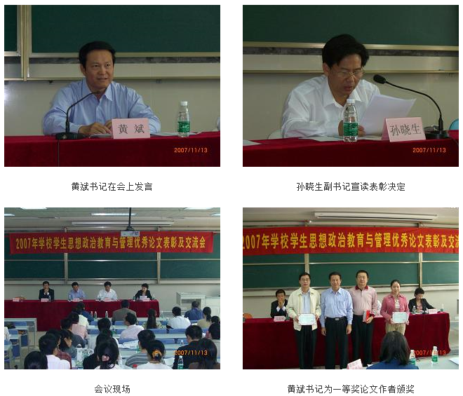 11月13日上午9点,2007年开云kaiyun官方网站学生思想政治教育与管理优秀论文表彰及交流会在大学城校区综合楼104举行。学校党委黄斌书记、孙晓生副书记、马定科助理、党办、校办、纪检、教务处、团委、学生处负责人、各二级学院领导、全体专兼职政治辅导员、获奖论文作者参加了会议。