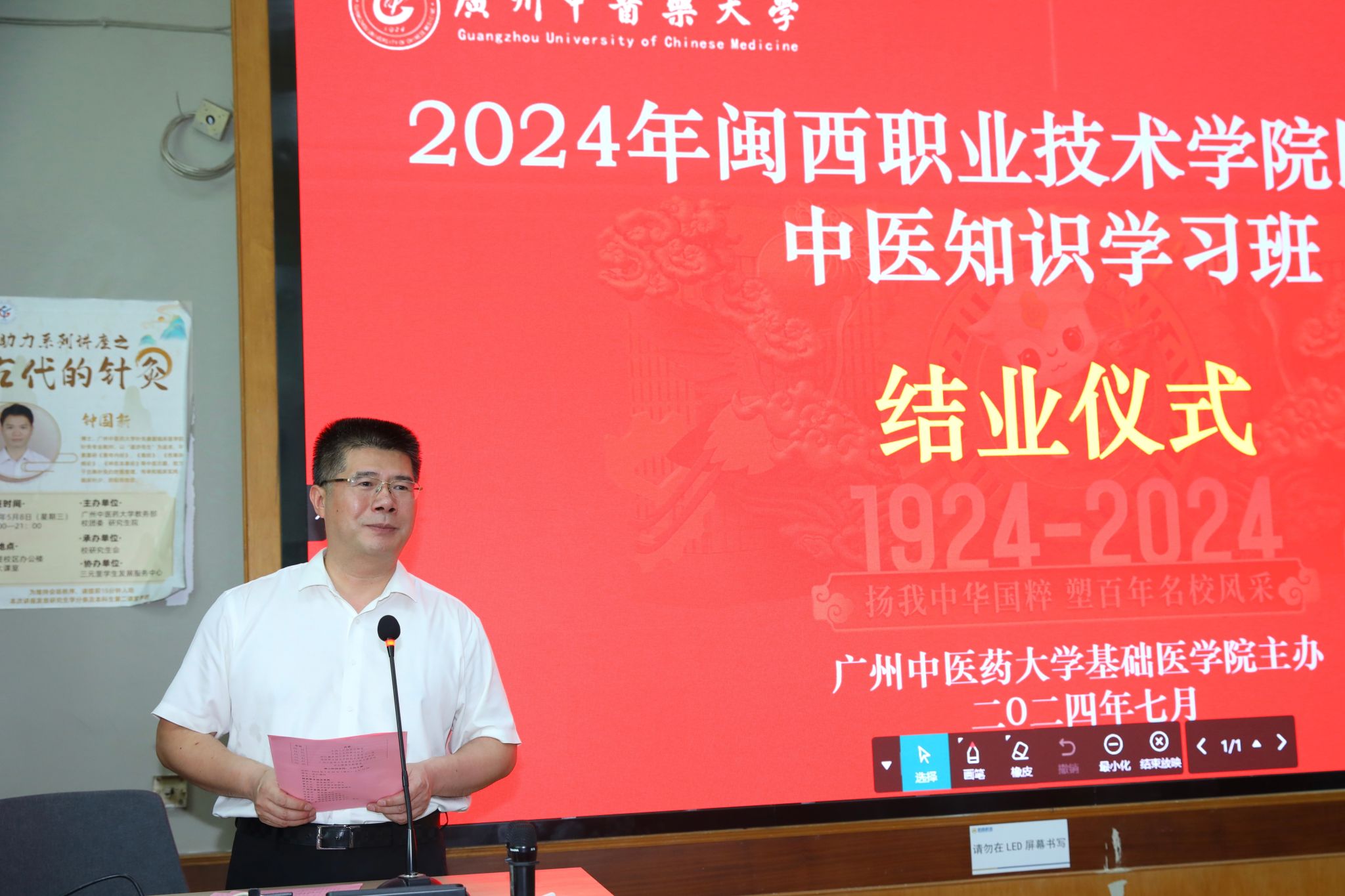 7月16—20日,2024年闽西职业技术学院医护教师中医知识学习班在我校三元里校区顺利举办。本次学习班由开云kaiyun官方网站基础医学院主办,继续教育学院、发展规划部协办。学校党委书记陈文锋,闽西职业技术学院党委副书记、校长梁俊平等出席结业仪式,学校党委副书记邱亚洪主持结业仪式。副校长刘中秋,闽西职业技术学院副校长刘路永出席开班仪式。
