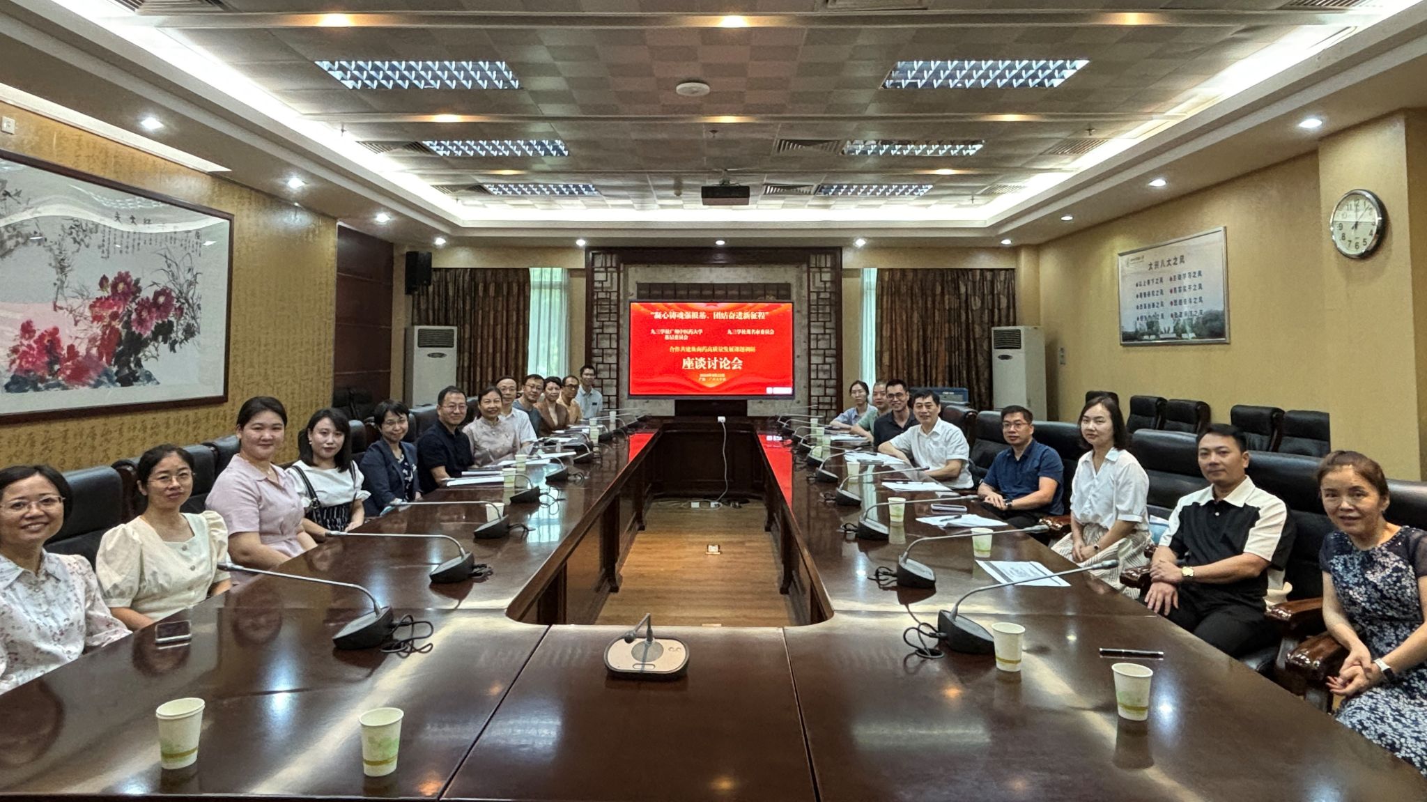 9月22日,九三学社茂名市委员会一行来到大学城校区,与我校九三学社基层委员会联合开展合作共建系列活动。双方举行了“合作共建及南药高质量发展”主题共建座谈交流会,共谋南药产业高质量发展路径。九三学社茂名市委会主委、茂名市人大常委会监察和司法工作委员会主任沈学生,九三学社茂名市委会副主委、茂名市电白区政协副主席梁谋,九三学社开云kaiyun官方网站基层委员会主委陈彩英,副主委潘华新、李穗晖等出席了座谈会。