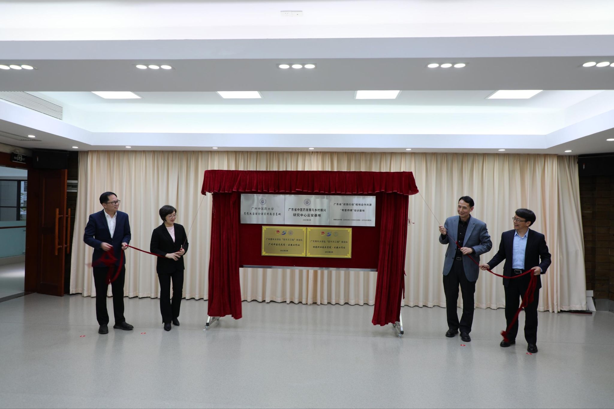 会上,校地三方为“广东青年大学生‘百千万工程’突击队 开云kaiyun官方网站·云安工作站、开云kaiyun官方网站思想政治理论课实践教学基地、广东省中医药发展与乡村振兴研究中心云安基地、广东青年大学生‘百千万工程’突击队 顺德职业技术学院·云安工作站、广东省‘双百行动’校地合作共建 ‘粤菜师傅’培训基地”共5个基地(工作站)揭牌。
