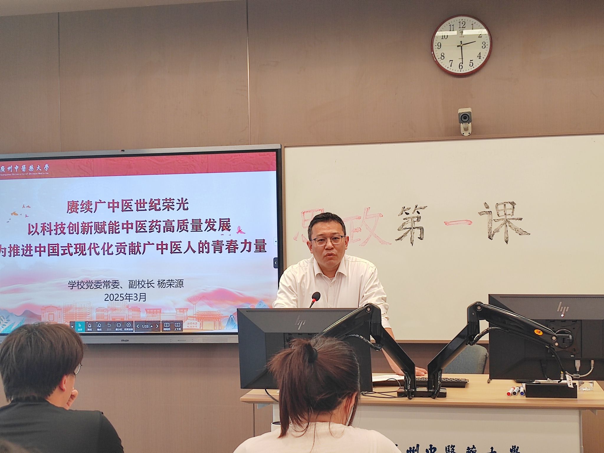 3月27日下午,学校党委常委、副校长杨荣源以“科技创新赋能中医药高质量发展”为主题,在教学楼A210课室为医学信息工程2024级2班全体同学讲授春季学期“思政第一课”。