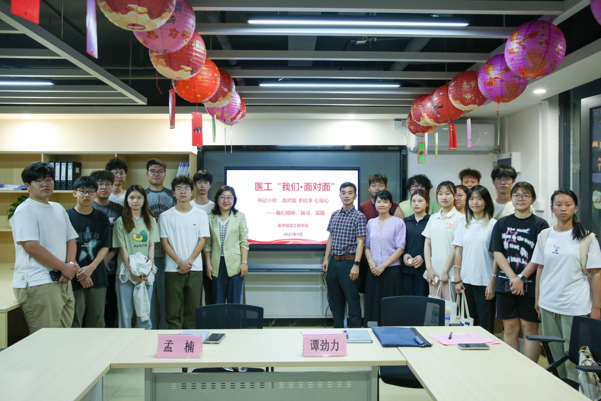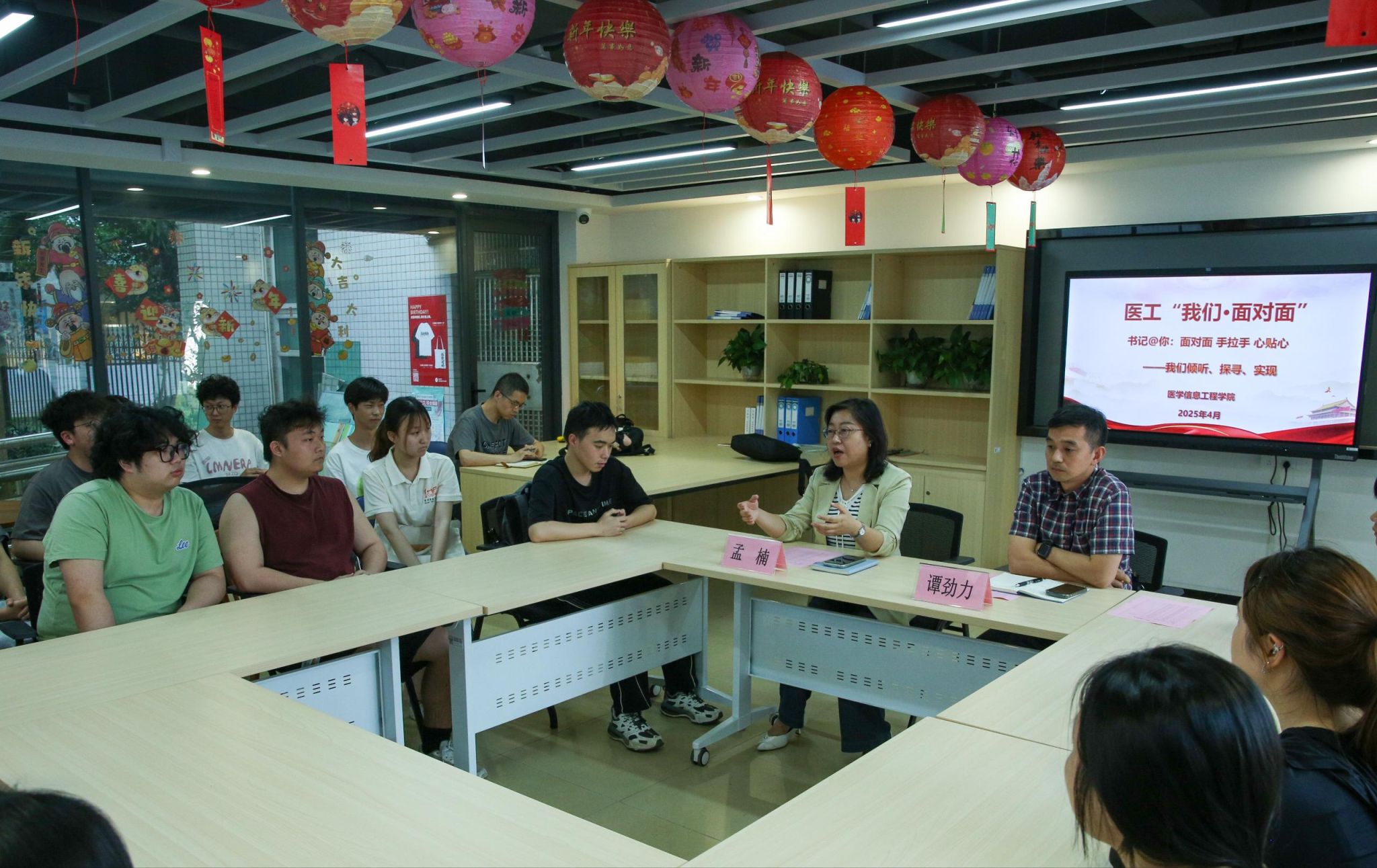“面对面才能手拉手,手拉手才能心贴心,我们才能真正在一起!”4月10日下午,医学信息工程学院“书记与你面对面”学生交流座谈会在“一站式”学生社区(辅导员工作室)举行。学院党委书记孟楠、党委副书记谭劲力与来自各年级的21名学生代表围坐一堂,围绕学业发展、职业规划、校园生活等学生关注的热点话题深度交流和探讨。