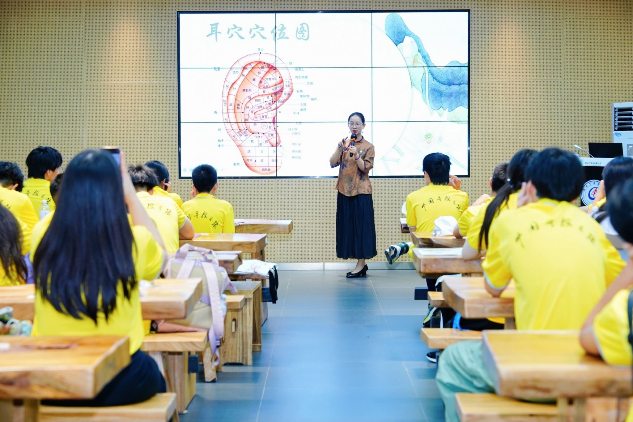 本次活动依托我校丰富的中医药教学、科研与文化资源,为营员们设计了内涵丰富的体验课程。营员们首先走进广东中医药博物馆,在被誉为“水晶宫”的大型液浸标本展区驻足观摩,感受生命科学与中医药学的奇妙交汇,随后聆听了《神奇的耳穴》专题讲座,学习耳穴保健知识,理解中医“小耳朵,大健康”的整体观智慧。实践环节中,营员们在我校专业指导下,亲手制作了具有驱虫、避暑、助眠功效的传统中药香囊,将中医药的实用性带入生活。