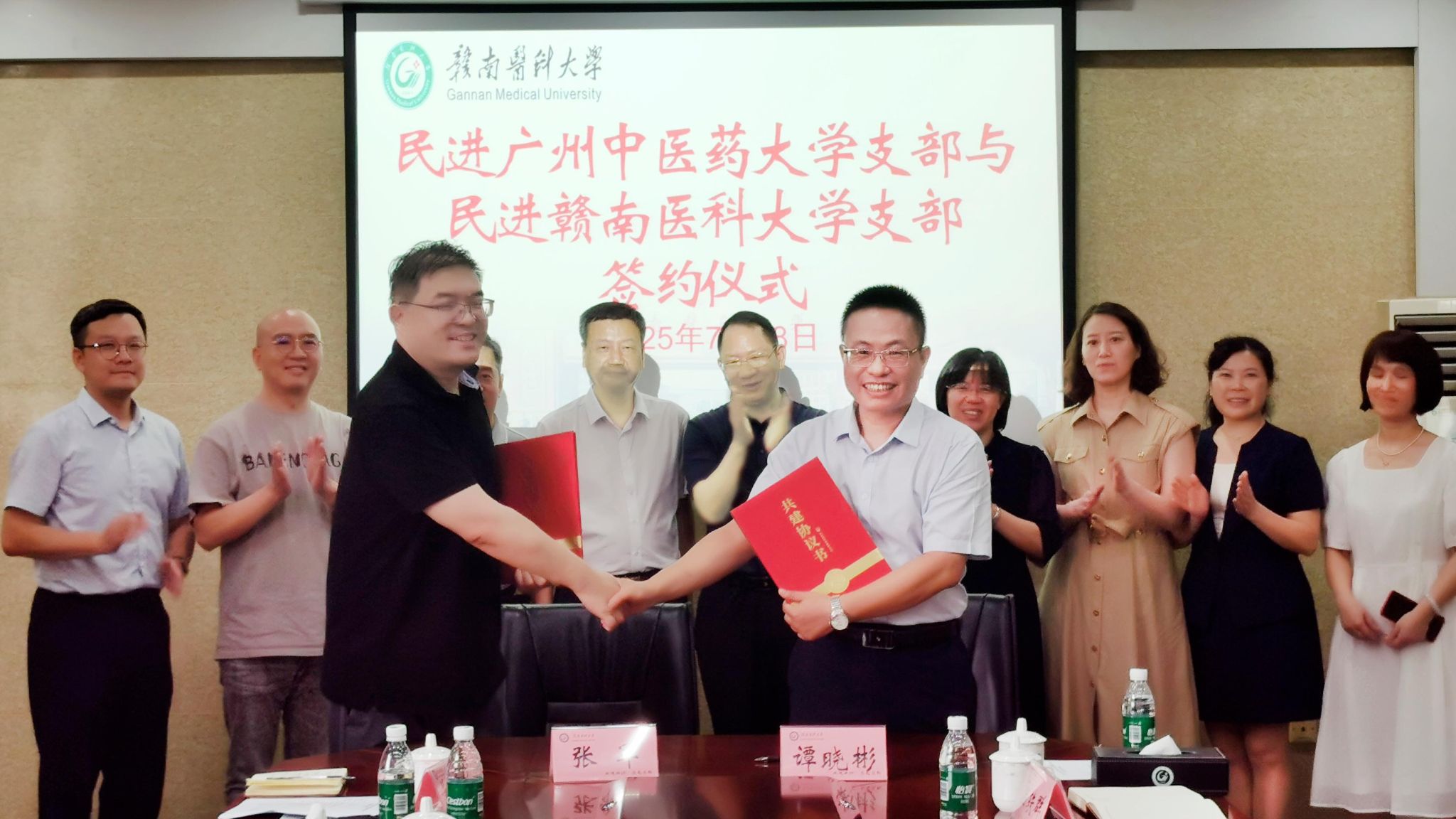 民进开云kaiyun官方网站支部与赣南医科大学支部举行共建签约仪式暨交流座谈会。中共赣南医科大学党委副书记黄瑞忠、民进赣州市委会专职副主委张玉萍、组宣部副部长陈雨生等出席。会上,民进赣南医科大学支部主委谭晓彬分享了支部在会员发展、活动开展、履职实践等方面的经验做法。双方围绕支部规范化建设、组织发展、履职能力提升等核心议题深入交流,共同探寻新时代民主党派基层组织高质量发展路径。黄瑞忠副书记寄语双方以共建为支点,传承红色基因,深化粤赣合作与校际统战工作,为基层组织建设注入新动能。