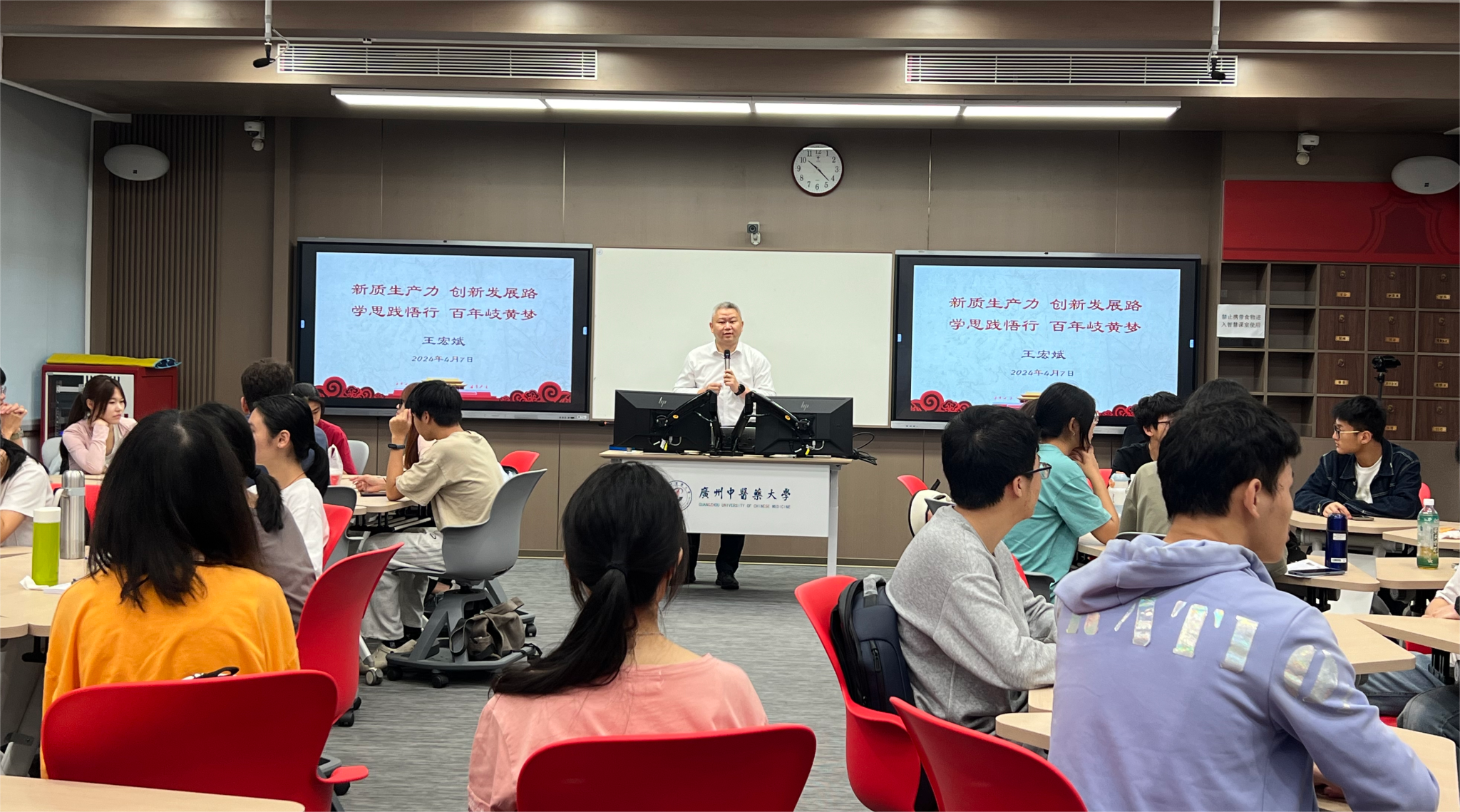王宏斌从现场同学们最关注的关键词“新质生产力”切入,通过两场“时光穿越”式的漫想,让同学们回顾和畅想20年前及20年后生活方式的变化,继而从“发展-破局-博弈”三部分总结过去的发展经验,使同学们能切身体会到新质生产力对我们现实生活各方面的影响,更好地理解“创新”在发展新质生产力中的必要性和重要性;同时结合全国两会、广东省高质量发展大会等会议精神,激发同学们思考大学生在发展新质生产力中应主动承担的角色和任务。