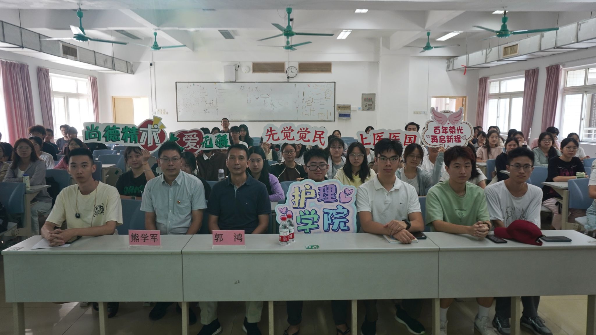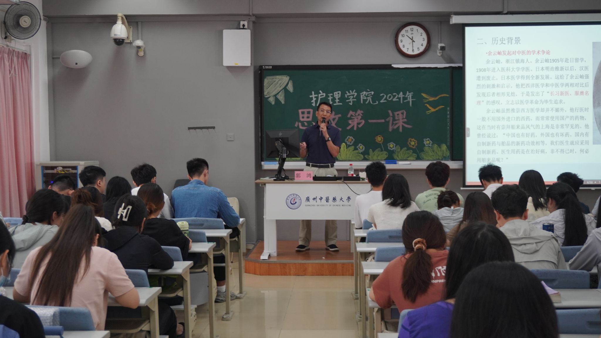10月9日上午,学校党委常委、副校长郭鸿以“百年岐黄,逐梦一流:迎接百年校庆,再造一个新广中医”为题,在教学楼B201为护理学院2022级学生讲授“思政第一课”。护理学院党委书记熊学军,学生工作办公室全体辅导员参加学习。