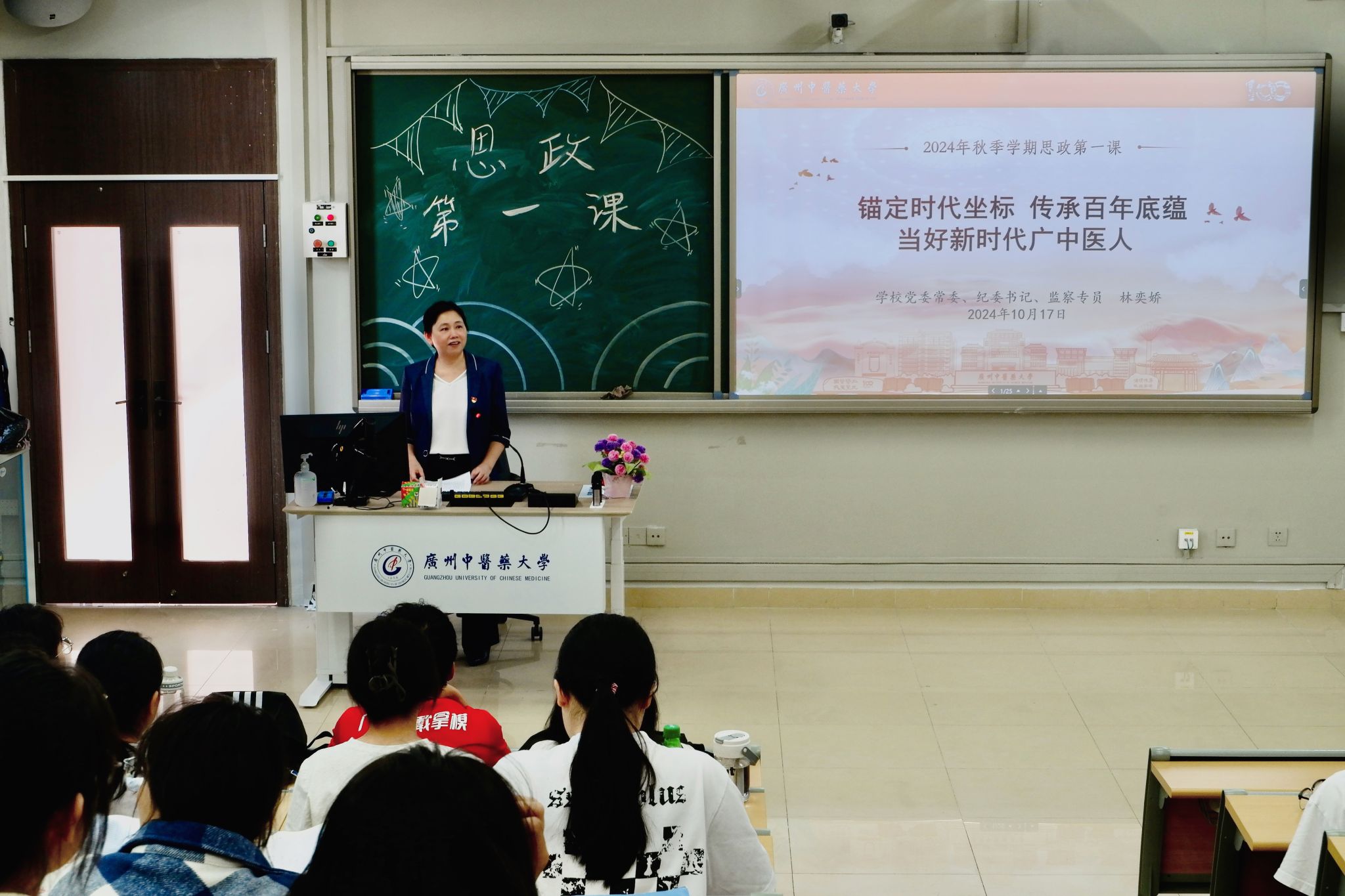 10月17日下午,学校党委常委、纪委书记、监察专员林奕娇以“锚定时代坐标,传承百年底蕴,当好新时代广中医人”为主题,为护理学院2023级护理专业2班的同学上了一堂生动而深刻的“思政第一课”。护理学院党委书记熊学军和学工办老师一同参加学习。