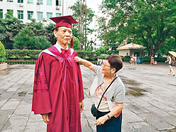 80歲的王炳霖出席畢業典禮,太太陪伴一旁為他細心整理畢業服。