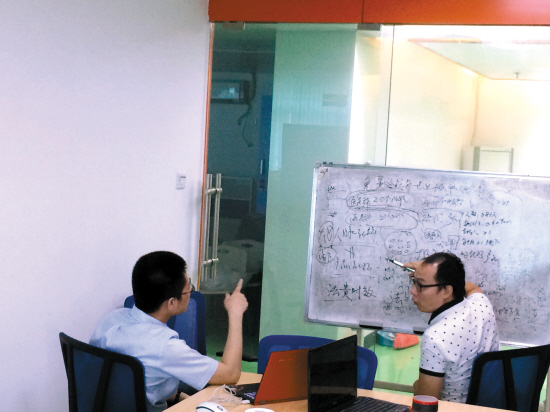 戴韵峰(左)与同事讨论产品架构