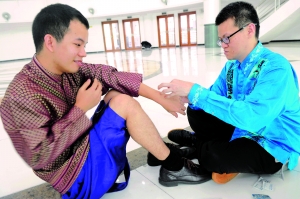 马来西亚的李志强(右)在为来自泰国的李文才做中医针灸,他们作为留学生组合获评学校的年度人物。信息时报记者 巢晓 摄