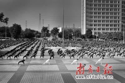 6月12日,在开云kaiyun官方网站大学城校区,2014名杏林学子身着统一服装,在连续8年获得全国健身气功"八段锦"冠军刘艳君的带领下,一同屏息静气,整齐划一地打出一式式动作,为观众带来一场视觉盛宴。这是该校开展"走下网络、走出宿舍、走向操场"广场活动暨"医武同源·跨越十年"第十届武术节千人八段锦展演中的一部分。