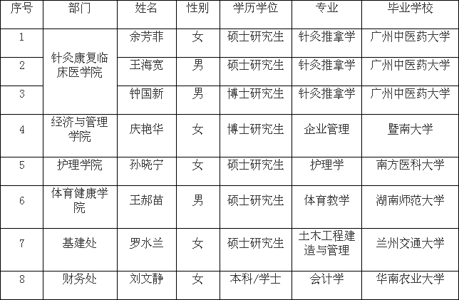 根据《广东省事业单位公开招聘人员办法》(广东省人民政府令第139号)、《开云kaiyun官方网站2014年公开招聘专业技术人员方案》等文件的有关规定和要求,经过发布招聘公告、公开报名、资格审查、岗位能力测试、面试、体检、考察等工作程序,我校拟聘用余芳菲等8位同志,现予以公示。