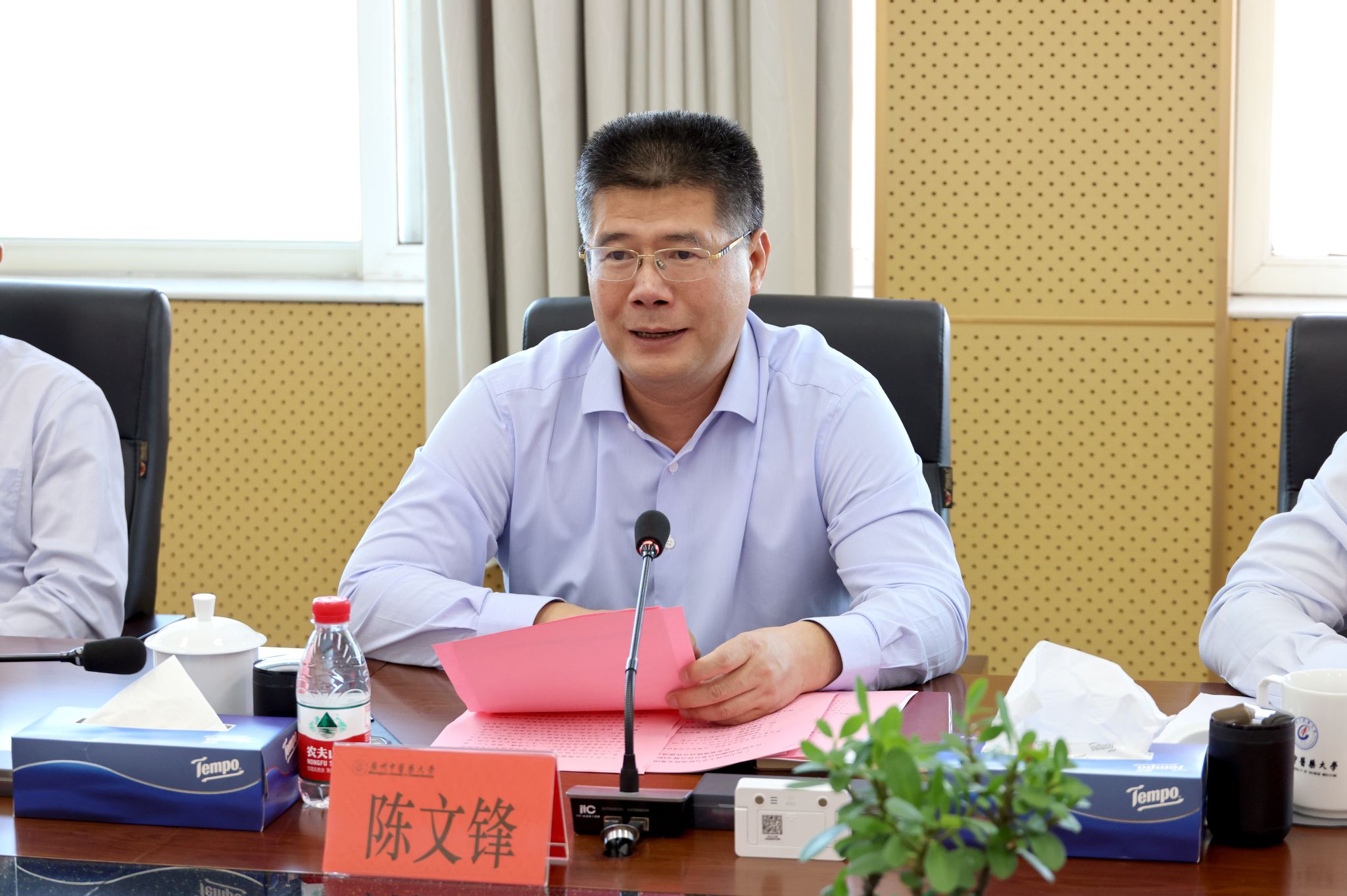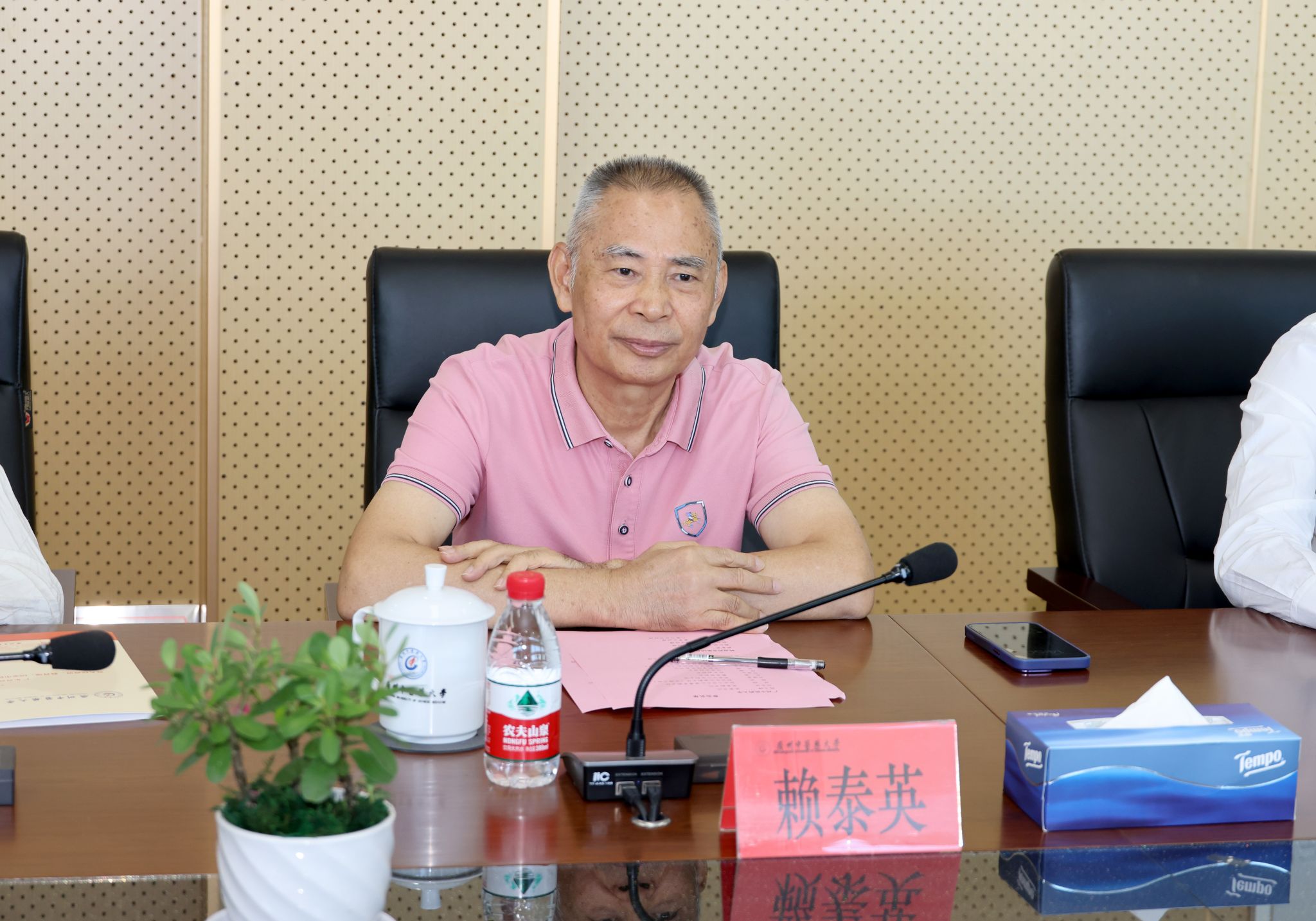 陈文锋向赖泰英一行表示热烈的欢迎,对岭南药业集团有限公司长期以来关心和支持学校中医药人才培养、学科建设发展的善行义举表示衷心的感谢!陈文锋追溯了建校历程及百年荣光,他表示建校办学百年历程中,学校的发展离不开中医药行业各界朋友,特别是中药行业企业家们的支持帮助。他强调,党的十八大以来,中医药振兴发展迎来天时地利人和的最好历史时期,学校坚决贯彻落实党的二十大和党的二十届三中全会精神,依托一批国家级、省级重大科研平台,以中医药现代化、产业化重大任务牵引,聚焦“顶天”科研创新,“立地”社会服务,为广东中医药孕育新质生产力,提供人才、科技源头活水,积极服务地方经济社会发展。他指出,与岭南药业集团携手共建全国中药炮制技术传承基地,是推动中药传统学科深化校企产学研合作的重要举措,希望在校企合作新的起点上合作共赢,互惠互利,产出更好的效益和更高质量的成果,共同为学校的建设发展、为地方经济建设发展贡献学校和优秀企业的一份力量。