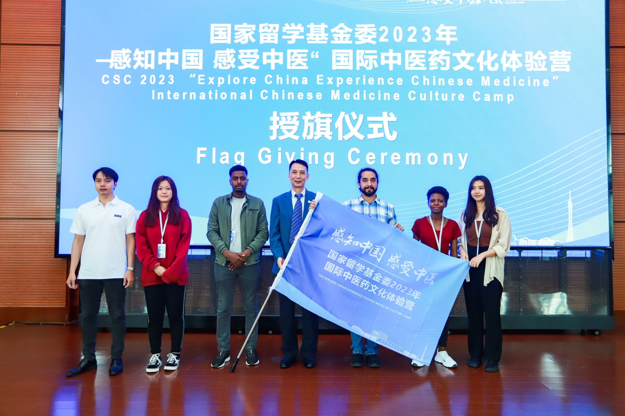 郭鸿副校长在启动仪式上致辞,并为学生代表授旗。他表示,希望通过讲座、参访和亲身体验的方式带领国际学生体验中医药文化,提升国际学生对中国传统文化的认识,同时希望同学们主动与自己在海内外的亲朋好友分享此次活动的感受,向他们介绍中国传统文化,促进不同文化间的交融,推进国与国之间的交流和友谊。