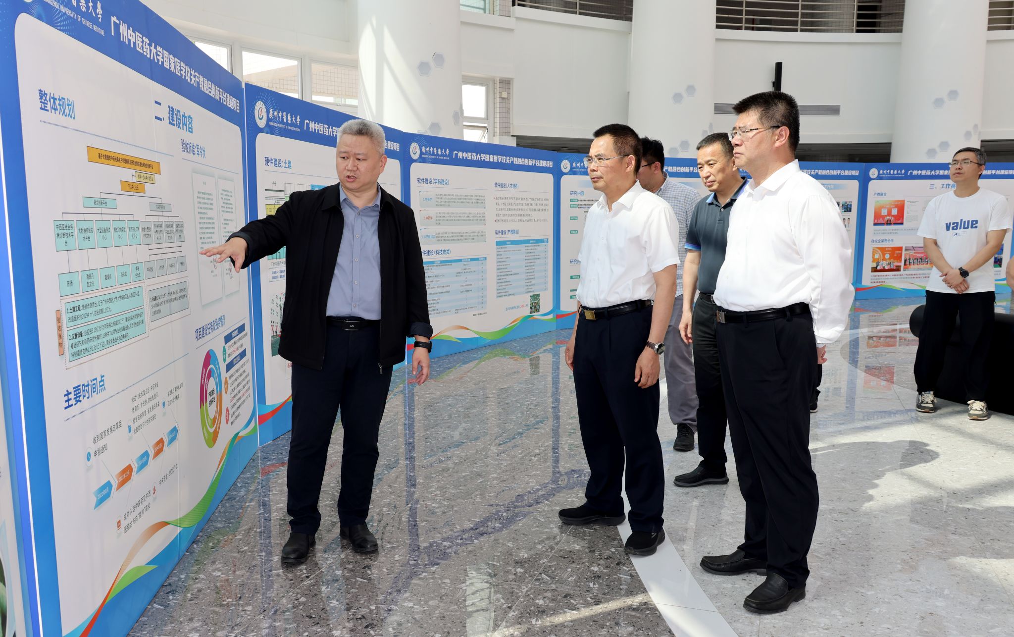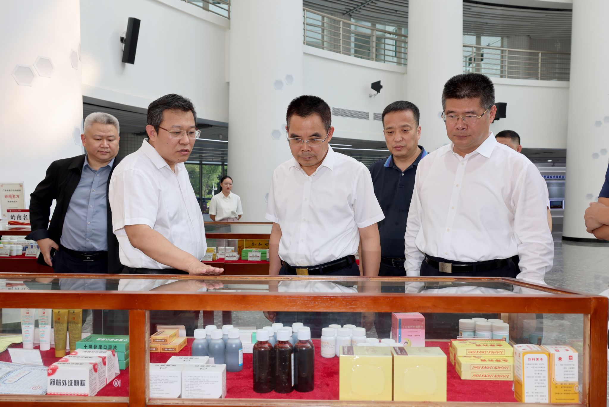 杨荣源重点介绍了学校附属医院自主研发的院内制剂及中药新药成果展柜,其中数十项成果已成功进入市场。