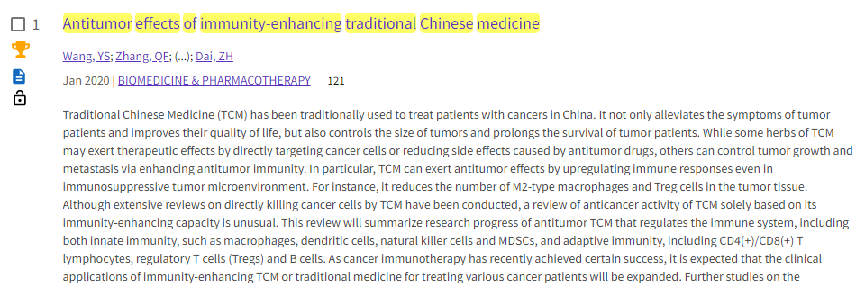 近日,我校第二附属医院(广东省中医院、广东省中医药科学院、中国中医科学院广东分院)中医药免疫调节研究团队戴振华教授及其团队发表在国际学术期刊《Biomedicine & Pharmacotherapy》(影响因子7.42,中科院小类-药学方向一区,JCR-Q1,2020年发表)题为“Antitumor effects of immunity-enhancing traditional Chinese medicine”(系统总结中医药免疫调节机制及其抗癌效果)的中医药领域综述论文,被Web of Science列为高被引论文(同一年同一个ESI学科发表论文的被引频次按照由高到低进行排序,排在前1%的论文),目前他引82次,标志着该篇综述在药学学科具有较高的学术影响力。近十年来肿瘤免疫已经成为国际医学研究热点,中医药抗肿瘤治疗有其独到之处,关于中药如何通过增强免疫反应而发挥抗肿瘤作用的研究已有报道,但有关中医药通过调节免疫反应抗肿瘤的综述却缺如。