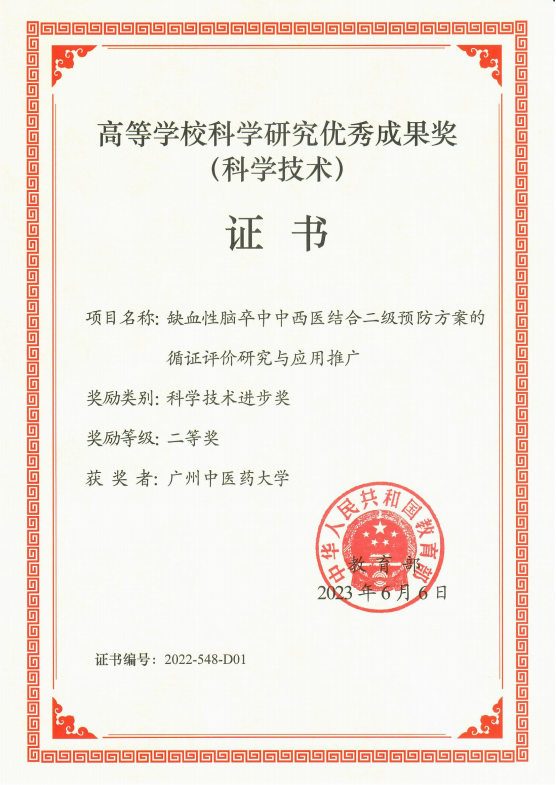 第二附属医院(广东省中医院)蔡业峰教授牵头申报的“缺血性脑卒中中西医结合二级预防方案的循证评价研究与应用推广”项目荣获教育部科学技术进步奖二等奖