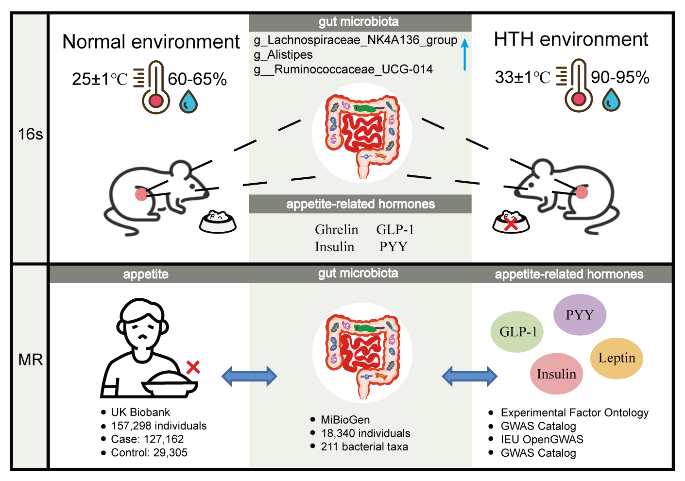 近年来,环境对人类健康的影响越来越受到人们的关注。长期暴露在高温高湿(HTH)环境下会导致高发病率和死亡率。这些也会导致脱水、热应激和食欲不振的发生。在HTH环境中观察到肠道微生物群的改变,可能在调节食欲方面发挥重要作用,其机制仍然是一个活跃的研究课题。此外,孟德尔随机化分析为探索肠道细菌与食欲之间的因果关系提供了一种有利的方法。该课题组之前的研究已经发现HTH环境暴露会出现肠道微生物失调,但是在HTH中,肠道菌群与食欲之间的关系尚不清楚。该研究旨在探讨在HTH中肠道菌群对食欲抑制的关键作用。