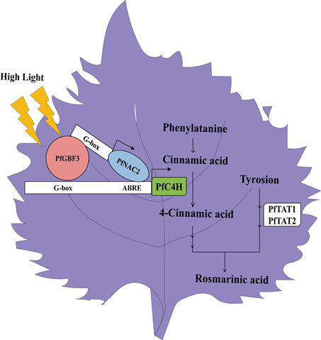 综上,该研究阐明了高光诱导紫苏RA合成的分子机制。揭示了PfGBF3、PfNAC2和PfC4H是正向调节RA积累的中心节点,PfGBF3可以激活PfNAC2及PfC4H表达,且PfNAC2也可结合PfC4H启动子诱导其表达,最终提高紫苏叶中Rad积累的调控规律,丰富了药用植物光诱导调控研究的基础。