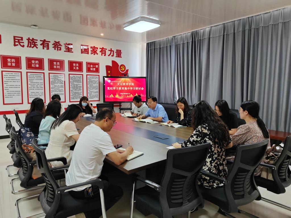 5月21日下午文化教育学院在五区党员活动室召开党纪学习教育集中学习研讨会。学院党总支书记展贤东、院长史丽珍及党总支委员、教师支部委员和学生支部委员参加此次会议。