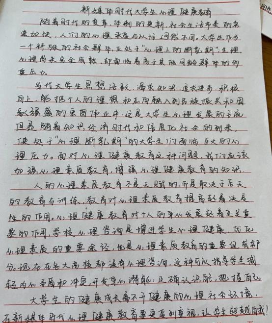在班级统一向全体同学组织了“心理征文”的活动,围绕“心光”主题,鼓励学生结合自身经历,阐述对心理健康的理解、在生活中遇到的挑战及自我成长的心路历程。无论是讲述克服困难的故事,还是对日常心理状态的思考,都在征文范围之内。