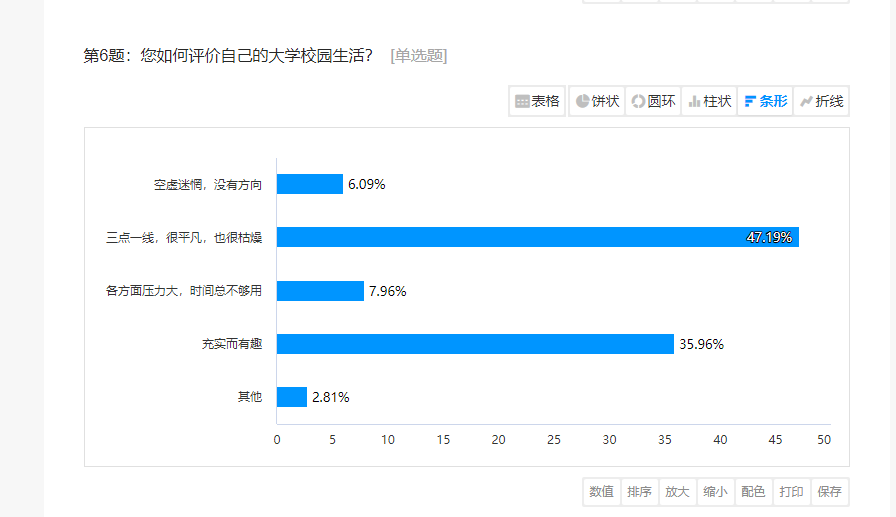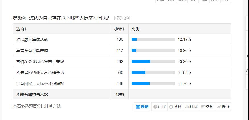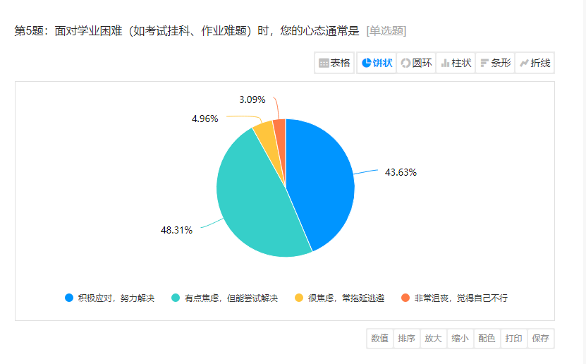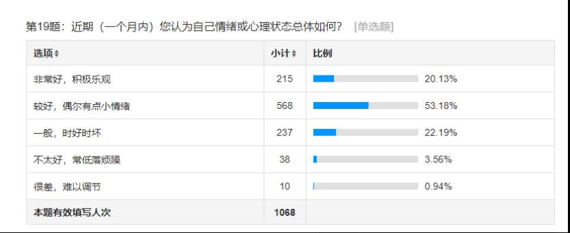 问卷内容通过压力水平、情绪状态、人际交往能力、情感状况等方面展开调查。由统计图可以看出大部分同学心理健康水平良好,极少数同学仍然存在心理问题,我院也将积极展开有关心理健康课程活动,舒缓学生心理压力,让学生更加美好的生活。本次调研活动为我院及早实施精准干预,建立健全的筛查预警机制打下了良好的基础。