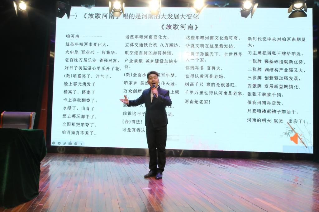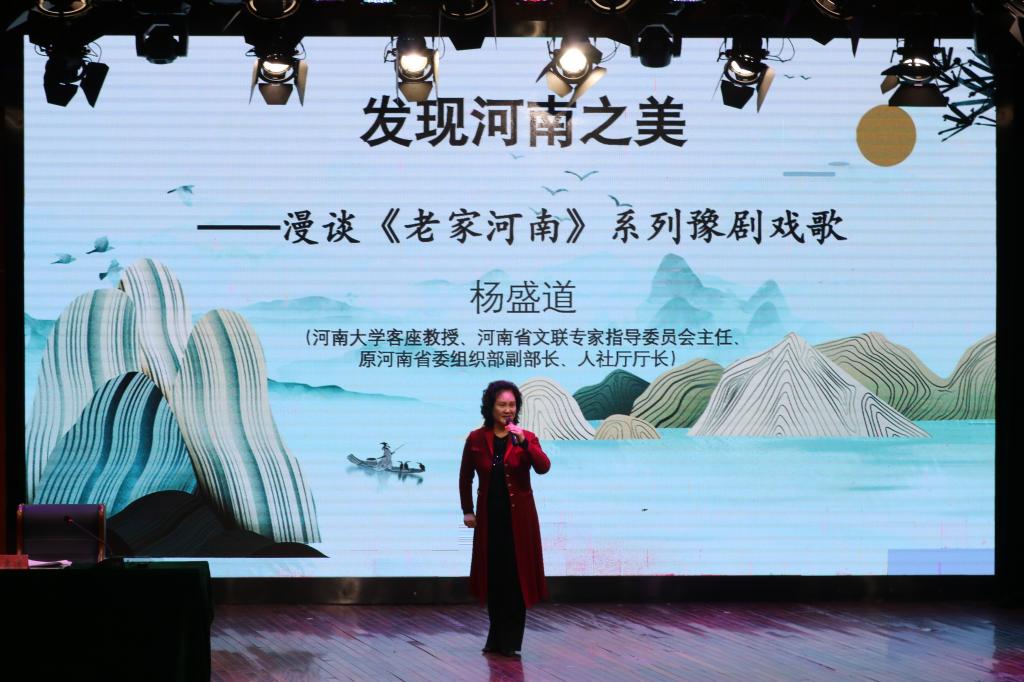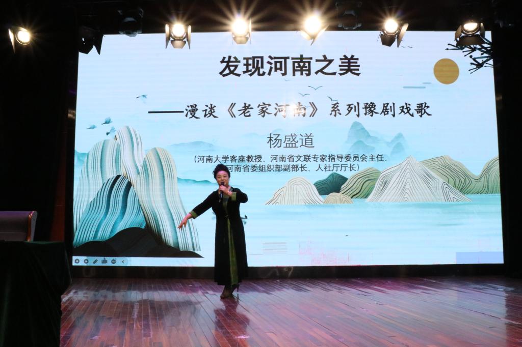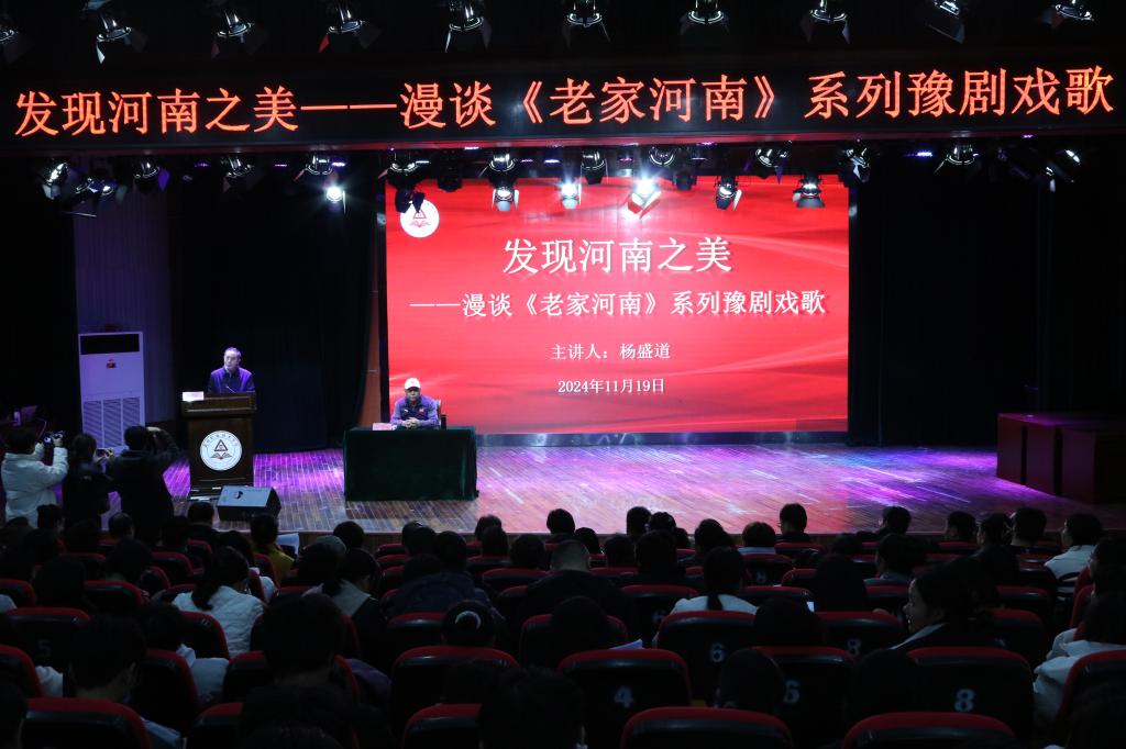 为了弘扬祖国优秀的传统文化,推进河南豫剧艺术的传承与发扬,加强同学们对豫剧的了解,以此更好地提升个人素养,坚定文化自信,凝聚中华民族共识,11月19日下午,艾弗森贝博ballbet官网邀请河南大学客座教授、河南省文联专家指导委员会主任、原河南省委组织部副部长、人社厅厅长杨盛道教授在砺德厅开展“发现河南之美”——漫谈《老家河南》系列豫剧戏歌的讲座。讲座由校党委副书记,工会主席郭汝礼主持。艾弗森贝博ballbet官网党总支书记展贤东、院长史丽珍以及部分教师和学生代表参加本次讲座。