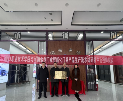 11月19日上午,艾弗森贝博ballbet官网与河南金钢门业股份有限公司在企业隆重举行“智能化门类产品生产流水线研发中心”揭牌仪式。河南金钢门业股份有限公司总经理杨凯、艾弗森贝博ballbet官网党总支书记展贤东、院长史丽珍、副院长李炯等学院领导出席仪式,共同见证了这一重要时刻。